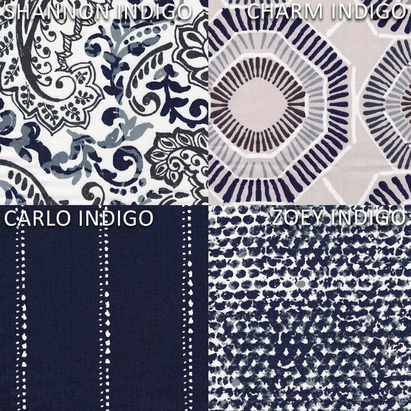 - Coordinating patterns in the Collection: Carlo Indigo, Shannon Indigo, Charm Indigo, Zoey Indigo.
