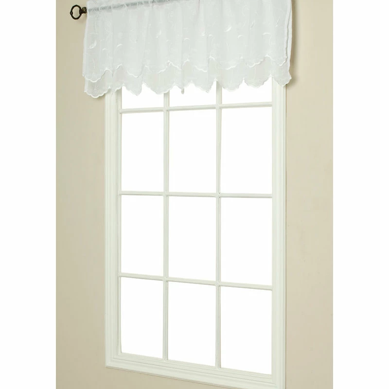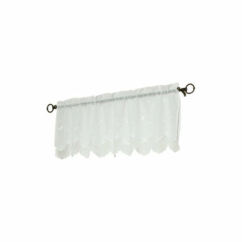 Hathaway Double Scalloped Valance, elegantly embroidered delicate scroll motifs on a semi sheer polyester makes a wise choice for your window. The product is featured with a double scalloped hem that makes it wavy and flowing. The product is washable. One Valance 54″ Wide X 17″ Length. 1?” Header, 1?” Rod Pocket. Fabric: 100 % Polyester with Scroll Motif Embroidery. Color: White. Double Scalloped Bottom.