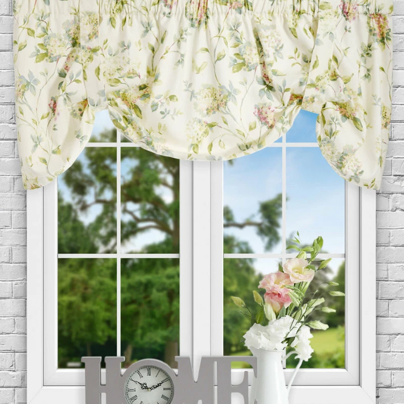 Bring the gorgeous sights of Spring indoors. Our traditional hydrangea pattern on high quality fabric will drape beautifully and bring a breath of fresh air into the entire room. Abigail is a multi colored traditional Hydrangea floral print pattern on solid natural colored ground that features a range of shades and colors that coordinate easily with a variety of solids and patterns within your home. Made with 52-percent polyester/48-percent 5-ounce cotton fabric creates a smooth draping effect, soft texture and easy maintenance. Tie-Up Valance is a one-piece valance that includes two strap ties and a decorative 3-inch rod pocket for easy hanging. Width is measured overall 60-inches, length is measured overall 22-inches from header to bottom hem. For wider windows simply add multiple valances together. Tie-Up Valance can be used with matching Abigail Tailored Panels with Tiebacks and Tailored Tiers for a custom look. Matching Abigail Valances, Panels, Tiers and Shower Curtain also available. Machine washable.
