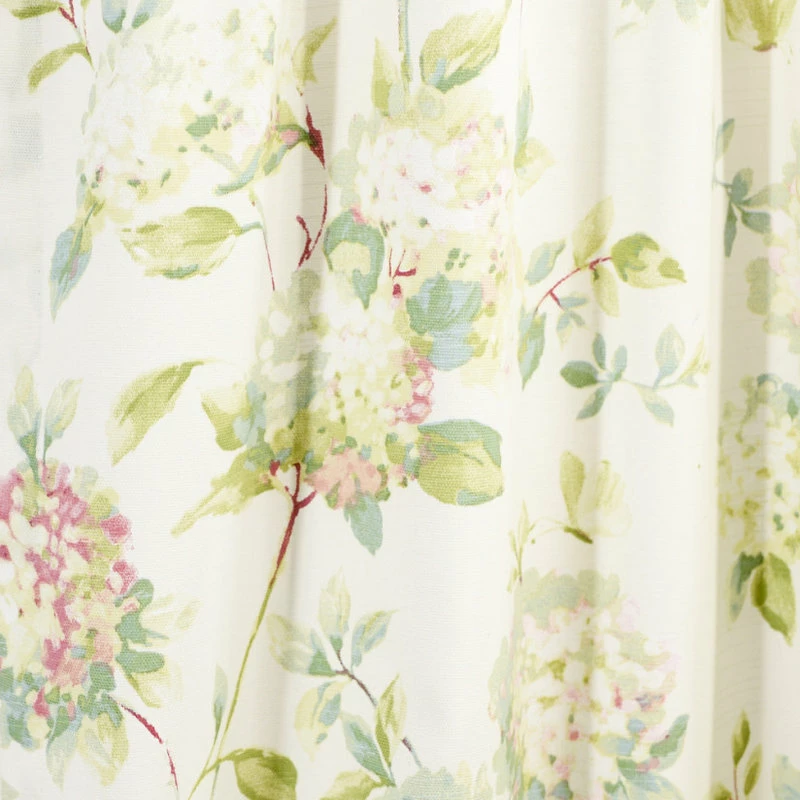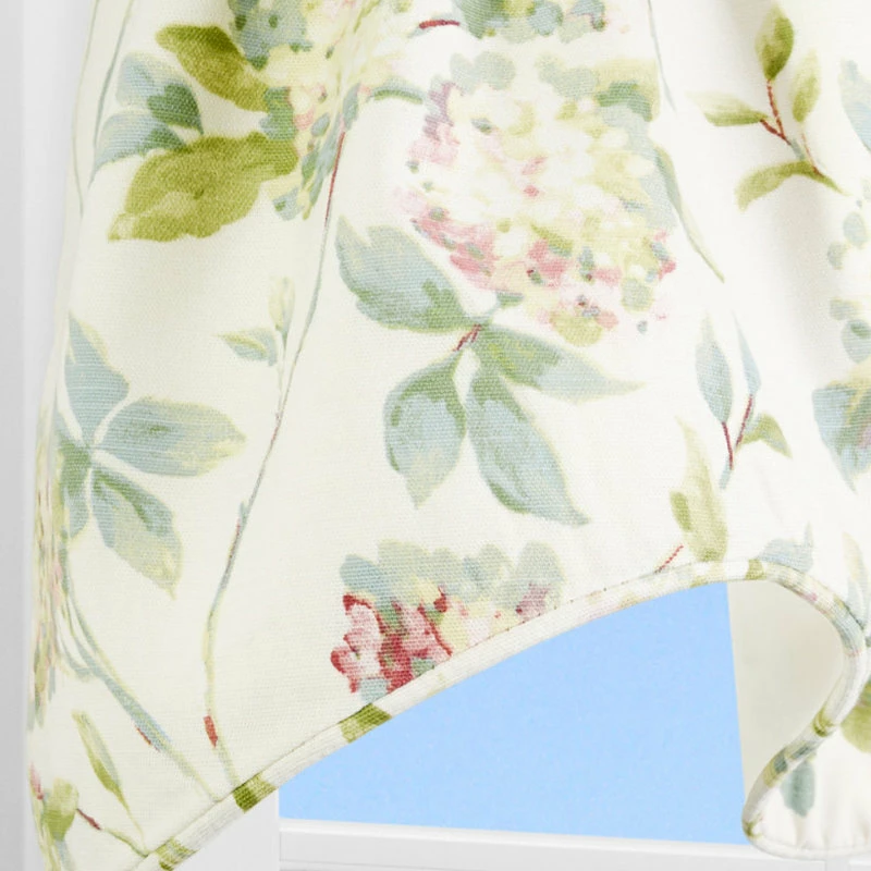 Bring the gorgeous sights of Spring indoors. Our traditional hydrangea pattern on high quality fabric will drape beautifully and bring a breath of fresh air into the entire room. Abigail is a multi colored traditional Hydrangea floral print pattern on solid natural colored ground that features a range of shades and colors that coordinate easily with a variety of solids and patterns within your home. Made with 52-percent polyester/48-percent 5-ounce cotton fabric creates a smooth draping effect, soft texture and easy maintenance. The Scallop Valance is constructed with a 3-inch rod pocket, decorative 2-inch header and trimmed corded hem. A natural colored liner is added for additional light blocking abilities. Width is measured overall 70-inches, length is measured overall 17-inches from stitch above rod pocket to bottom hem. For wider windows simply add multiple valances together. Scallop Valance can be used with matching Abigail Tailored Panels with Tiebacks and Tailored Tiers for a custom look. Matching Abigail Valances, Panels, Tiers and Shower Curtain also available. Machine washable.
