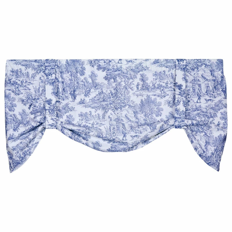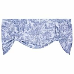 Ellis Curtain Victoria Park Toile Tie-up Valance–Toile print fabric originated in France in the 18th century and immediately became a popular decorating pattern that still holds true today. The classic country scenes and soft cotton fabric will change and improve the look and feel of any room while adding a touch of style. Made with 100 percent cotton creates a smooth draping effect and softer texture that can’t be achieved with inferior synthetic fabrics. You are sure to get a curtain that. s beautiful and functional in a decorating pattern that’s timeless and long lasting. The Tie-Up Valance is a one-piece valance that includes two adjustable strap ties for a truly unique look and easy hanging. It is made with a decorative 3” rod pocket. It Measures 60” wide. Length is measured overall 24” from header top to bottom of panel.