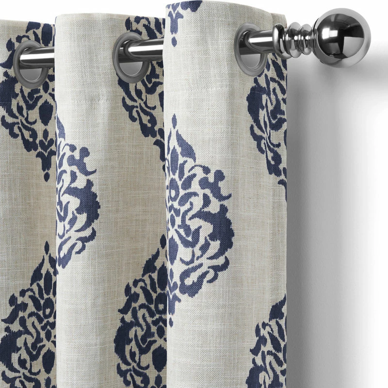 The Navara curtains feature an elegant block print medallion on a linen blend ground. These stylish window panels offer room darkening benefits and a rich texture. 1.65 inch brushed silver grommets are recommended with up to a 1 inch rod for maximum movement. Poly/Linen blend. Sold as a single, lined panel. Easy care, machine washable.