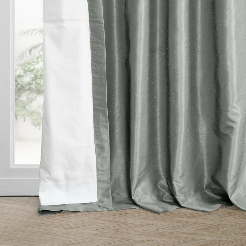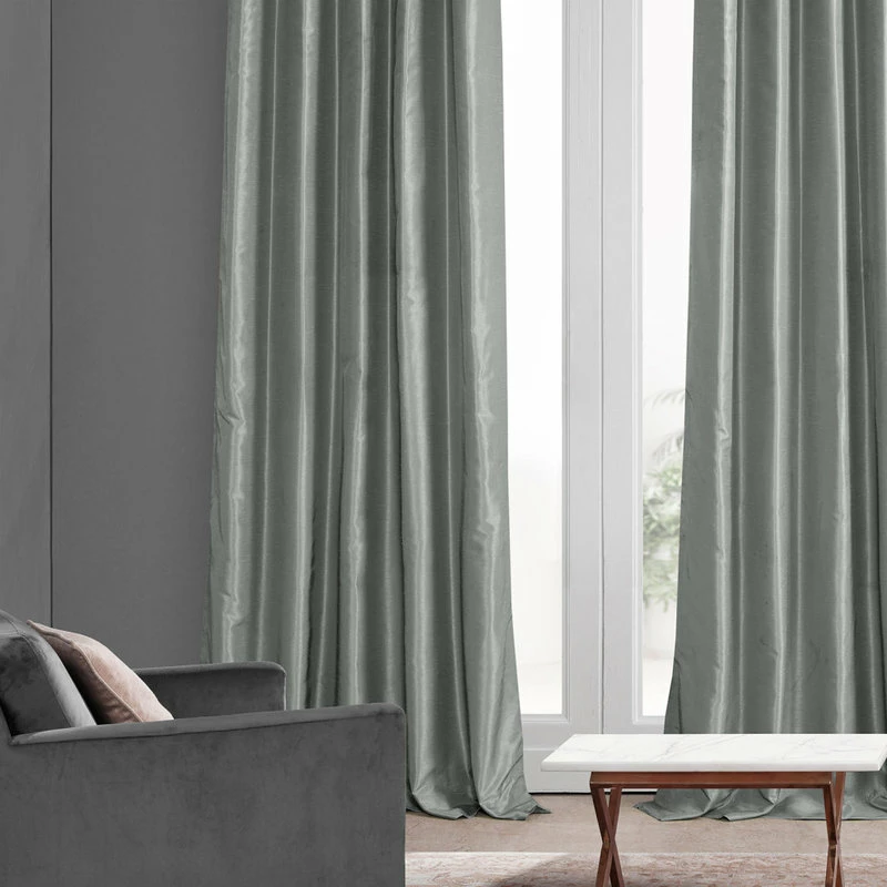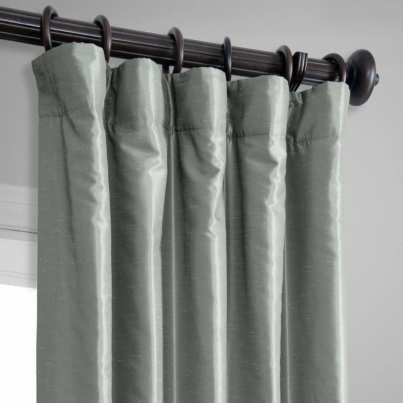 Our Vintage Textured Faux Silk curtains & drapes have a slight sheen that mimics the finest texture of silk dupioni. These curtains bring the look of luxury without the cost or high-maintenance care. Built-in are two header designs within a single panel. The attached back tabs for a formal pleated look and a traditional pole pocket. As a general rule, for proper fullness panels should measure 2-3 times the width of your window/opening.