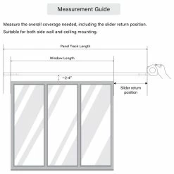 - 3-Panel Baton Draw Track with the total width adjustable from 36-66″. Individual Panel Size: 91.5″ Height x 23.5″ Wide. Overall Height including rail track is 94″. The height of the Panel is adjustable by simply trimming the Panel and re-attaching the Liner and Panel Weight (Instructions provided).