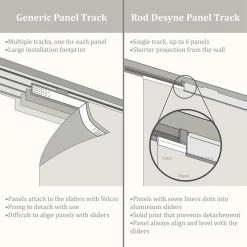 - Single Rail Patented design; 1.25″ thick for a very slick, thin, and compact design. No more bulky rail set ups. Made of steel for a durable and smooth operation of the Panels. Different from your standard panel track in that the sliders are designed in a more compact, overlapping fashion to reduce light bleed coming from in between the Panels.