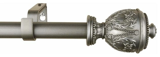 - The rod set includes 1 rod, 1 set of two finials, and brackets in a pewter finish.