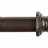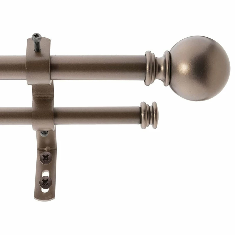 The front adjustable curtain rod measures 5/8″ diameter and comes with round ball finials; the back adjustable curtain rod measures 1/2″ diameter and comes with flat button shaped finials. Both rods extend from 84″ to 120″.